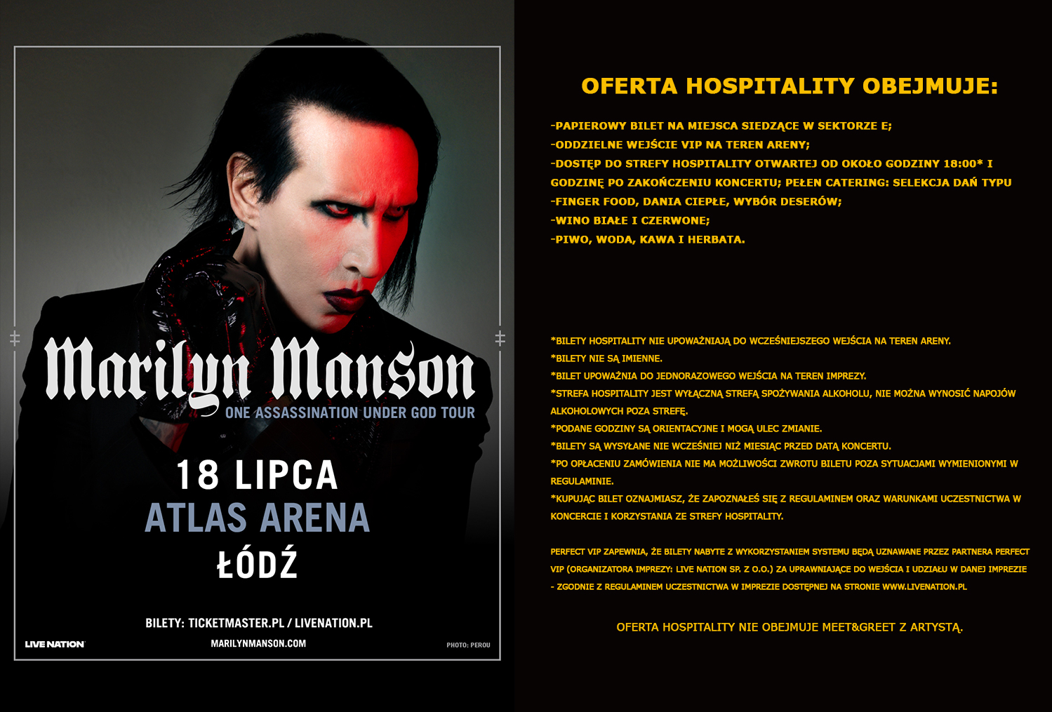 Wszelkie Informacje dotyczące Imprezy, w tym przede wszystkim informacje na temat harmonogramu przebiegu Imprezy, zmian organizacyjnych Imprezy (w tym Regulaminu Imprezy), na którą Użytkownik może kupić Bilet korzystając z Systemu, znajdują się wyłącznie na stronie partnera Perfect Vip (organizatora Imprezy: Live Nation sp. z o. o.) www.livenation.pl.