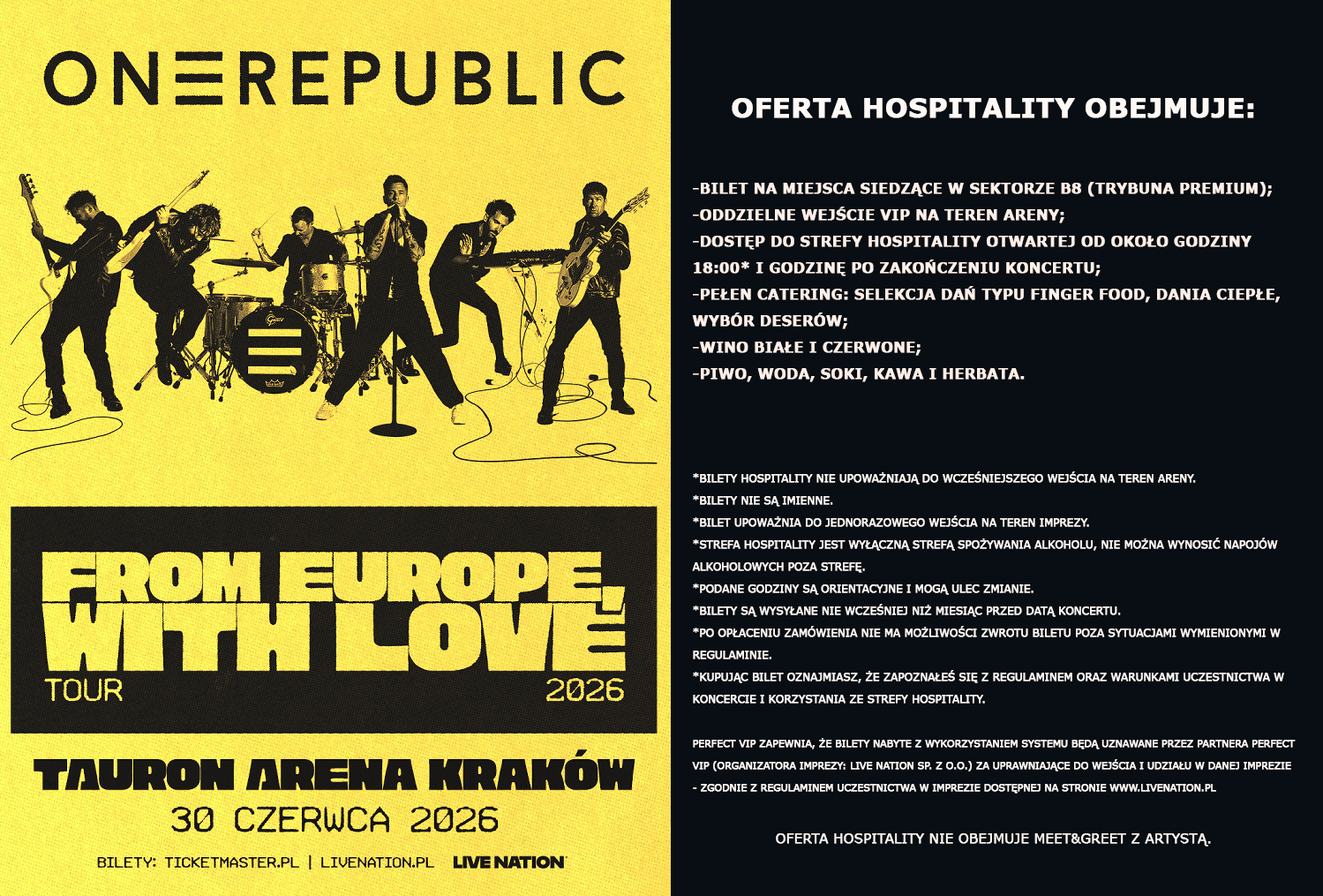 Perfect Vip zapewnia, że Bilety nabyte z wykorzystaniem Systemu będą uznawane przez partnera Perfect Vip (organizatora Imprezy: Live Nation sp. z o. o.) za uprawniające do wejścia i udziału w danej Imprezie - zgodnie z Regulaminem uczestnictwa w imprezie dostępnym na stronie www.livenation.pl.