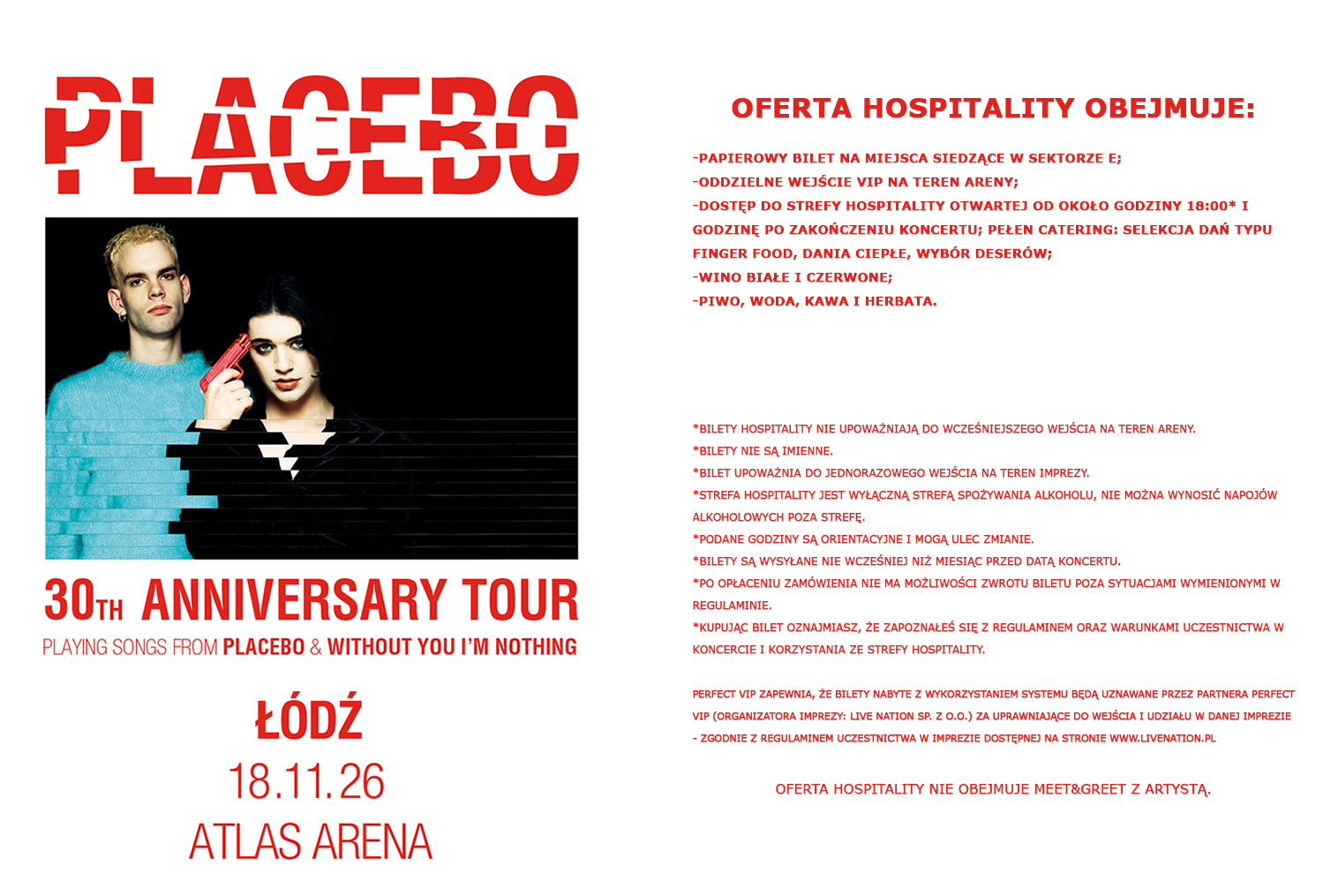 Perfect Vip prowadzi za pośrednictwem Systemu sprzedaż Biletów na Imprezę realizowaną przez partnera Perfect Vip (organizatora Imprezy: Live Nation sp. z o. o.). W związku z powyższym Perfect Vip oświadcza, że: a) nie jest organizatorem Imprezy; jak również b) nie jest odpowiedzialny za przebieg Imprezy.