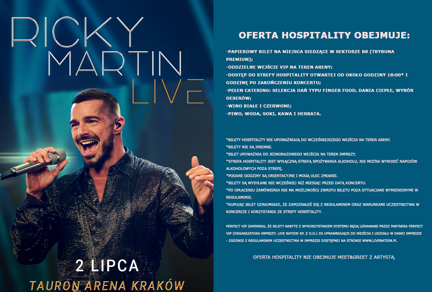 Perfect Vip prowadzi za pośrednictwem Systemu sprzedaż Biletów na Imprezę realizowaną przez partnera Perfect Vip (organizatora Imprezy: Live Nation sp. z o. o.). W związku z powyższym Perfect Vip oświadcza, że: a) nie jest organizatorem Imprezy; jak również b) nie jest odpowiedzialny za przebieg Imprezy.